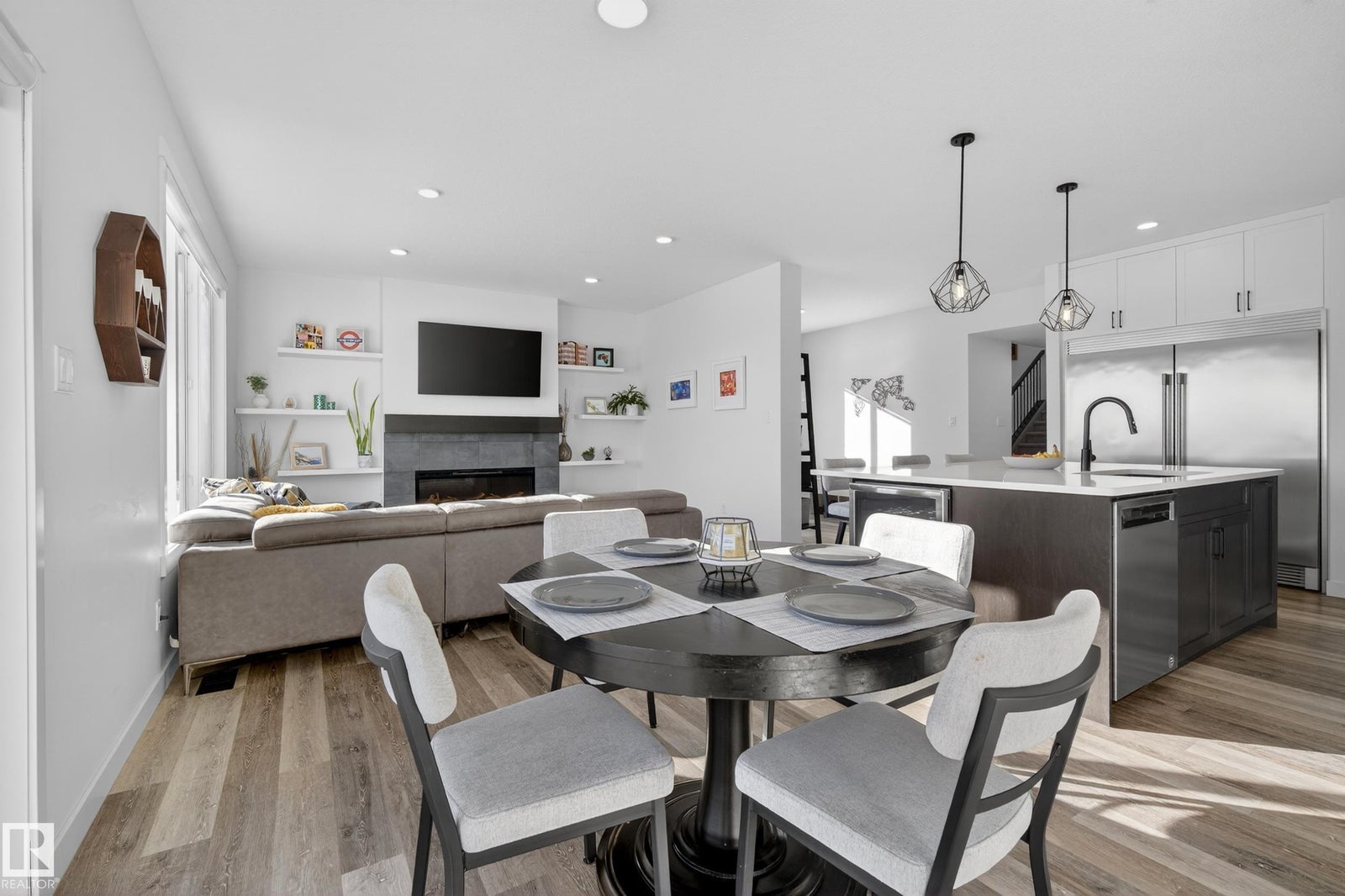 Rare pond-backing home on a quiet street with a walkout basement and double garage. The main floor features a beautiful kitchen with an oversized island, floor-to-ceiling cabinetry, butler’s pantry, and massive 64-inch fridge/freezer. Just off kitchen is the impressive 10'x26' deck with glass railings, perfect for relaxing or entertaining while enjoying peaceful pond views and local wildlife. The inviting living room offers a cozy electric fireplace, while maple-stained railings lead upstairs to a bright vaulted bonus room. The upper level includes upgraded bathrooms with tile accents, quartz countertops, and floating cabinetry with under-cabinet lighting. The walkout basement with 9-ft ceilings adds a bedroom and great living space with a 90-inch projector screen for movie nights. Step outside to a 260 sq ft concrete patio with electrical roughed in for future hot tub and exterior stairs from the deck. Energy saving features include 6.2kW of solar panels and upgraded high-efficiency furnace and AC unit.