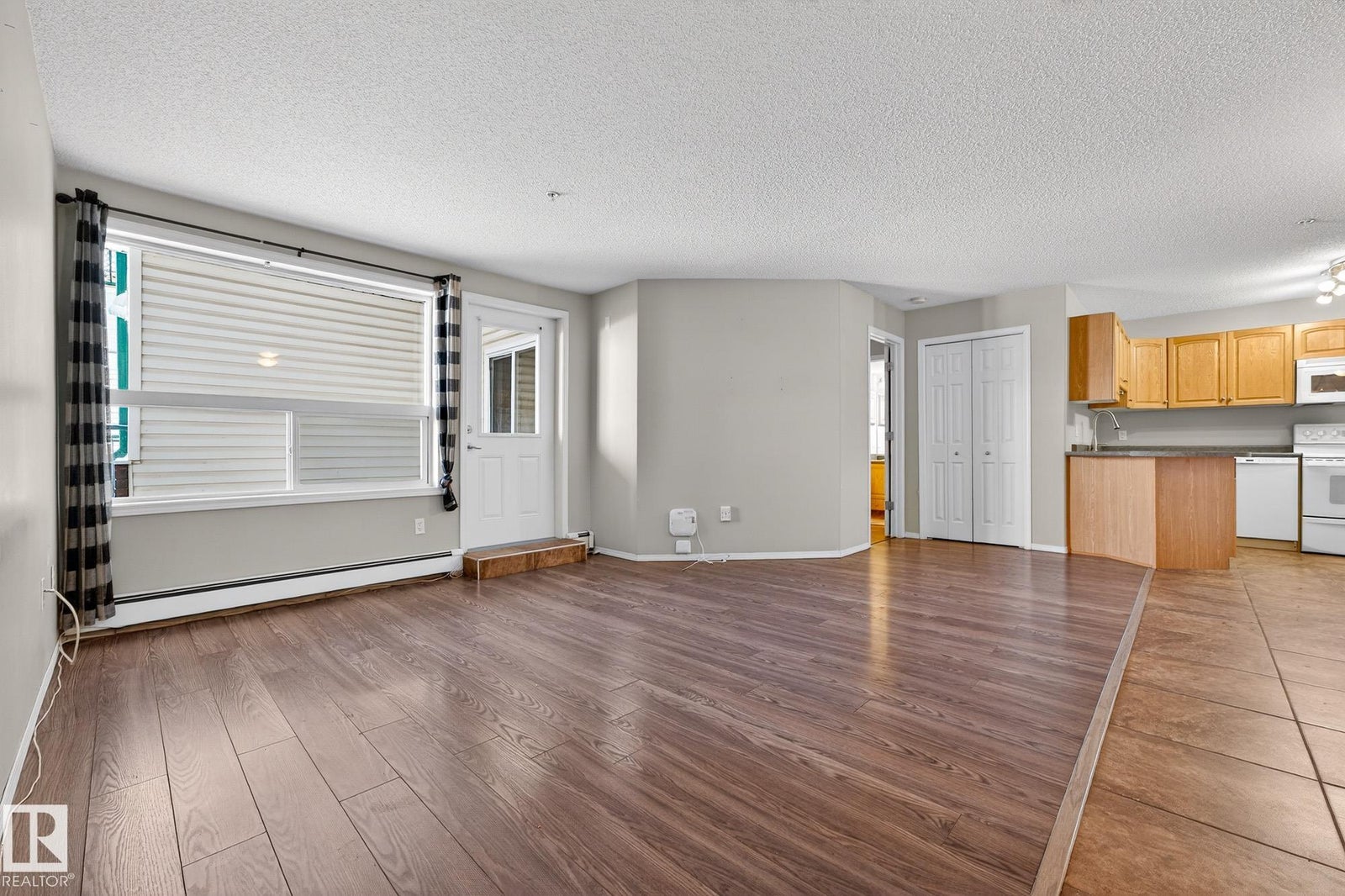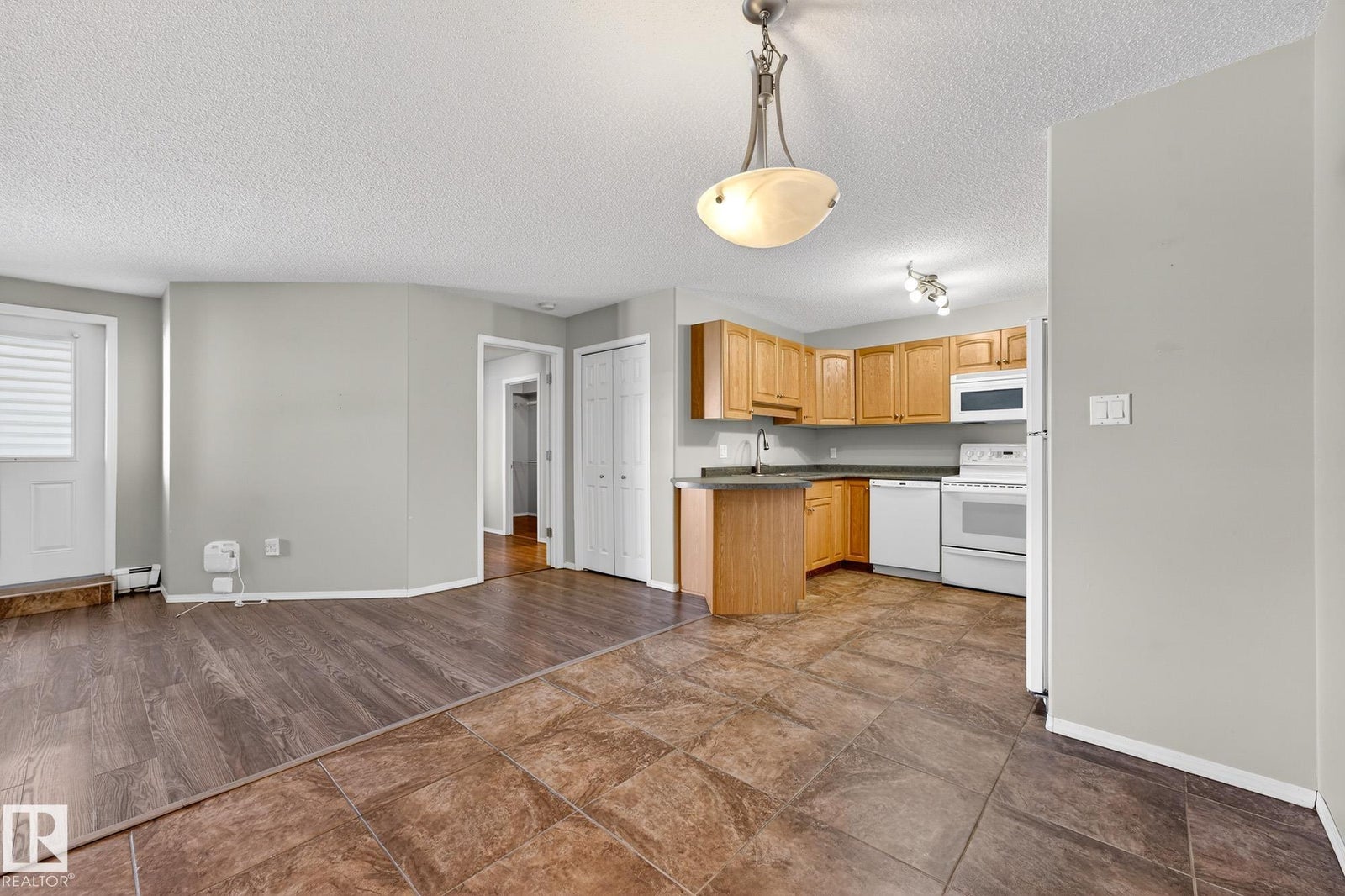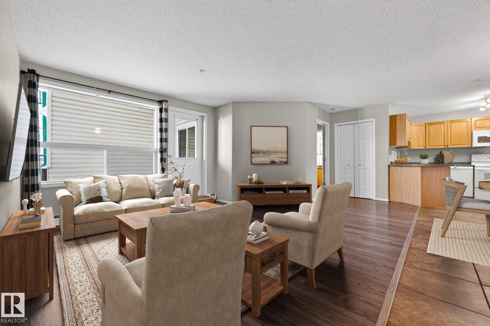 Welcome to this well-designed main floor condo offering a bright and functional layout in a desirable 18+ building. As you step inside, you are welcomed by a spacious foyer that opens into a generous living area, ideal for both everyday living and entertaining, with large windows allowing natural light to pour in. The adjoining dining space flows effortlessly into the kitchen, creating a seamless and inviting atmosphere for hosting or relaxing at home. Down the hall, you will find convenient in-suite laundry, a full bathroom, and a well-sized secondary bedroom that is perfect for guests or a home office. The primary retreat offers a comfortable escape with a walk-in closet and a private ensuite, giving you both space and privacy. This unit is complete with the rare bonus of 3 parking stalls, including one underground and two surface stalls, providing unmatched convenience for both residents and visitors. A fantastic opportunity to enjoy low maintenance living in a thoughtfully laid out home.